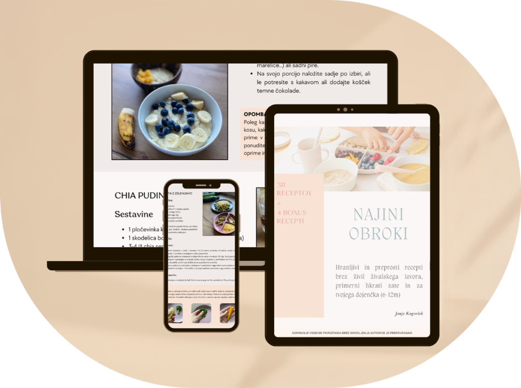 V knjižici najdeš 38 receptov in 4 bonus »skrite« recepte. Od zelo preprostih jedi na začetku uvajanja, do obrokov prilagojenih družinski prehrani.